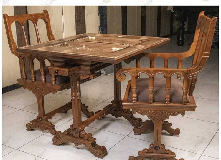 "وقتی بازی و هنر دست به دست هم میدهند! "هنر و اصالت در یک قاب! میز و صندلی تخته نرد و شطرنج، ساخته شده از چوب راش با معرقکاری و خراطی بینظیر، رنگ فندقی گرم و دلنشینسب برای لحظات خاص شما. "